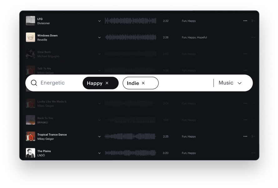 Use intuitive search and filtering to explore thousands of tracks, created by Grammy-award winning musicians. Download high quality songs for all your projects.