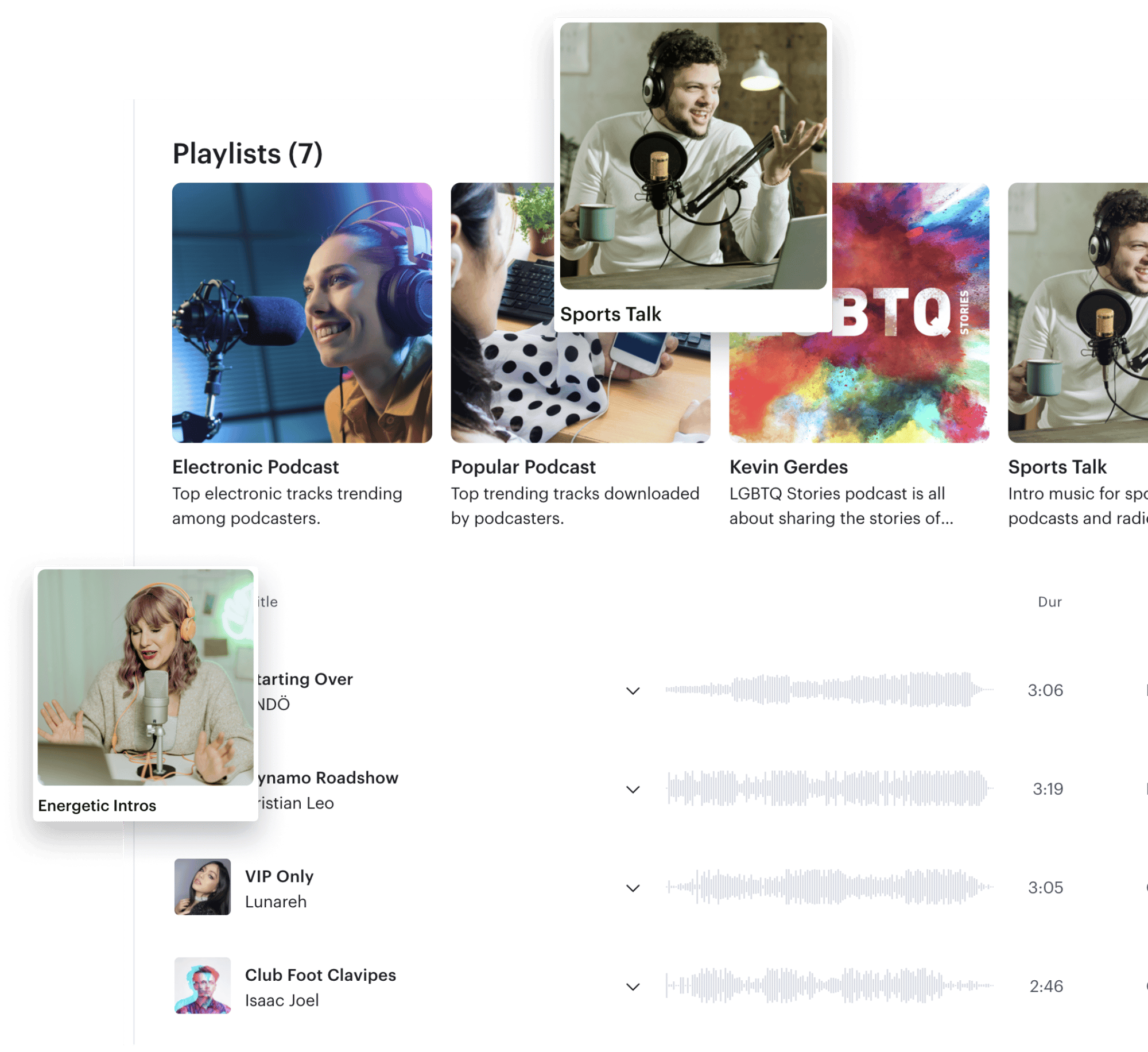 Discover the sound that sets your podcast apart with our curated selection of top artists. Never worry about your podcast being muted or even taken down due to a copyright claim.