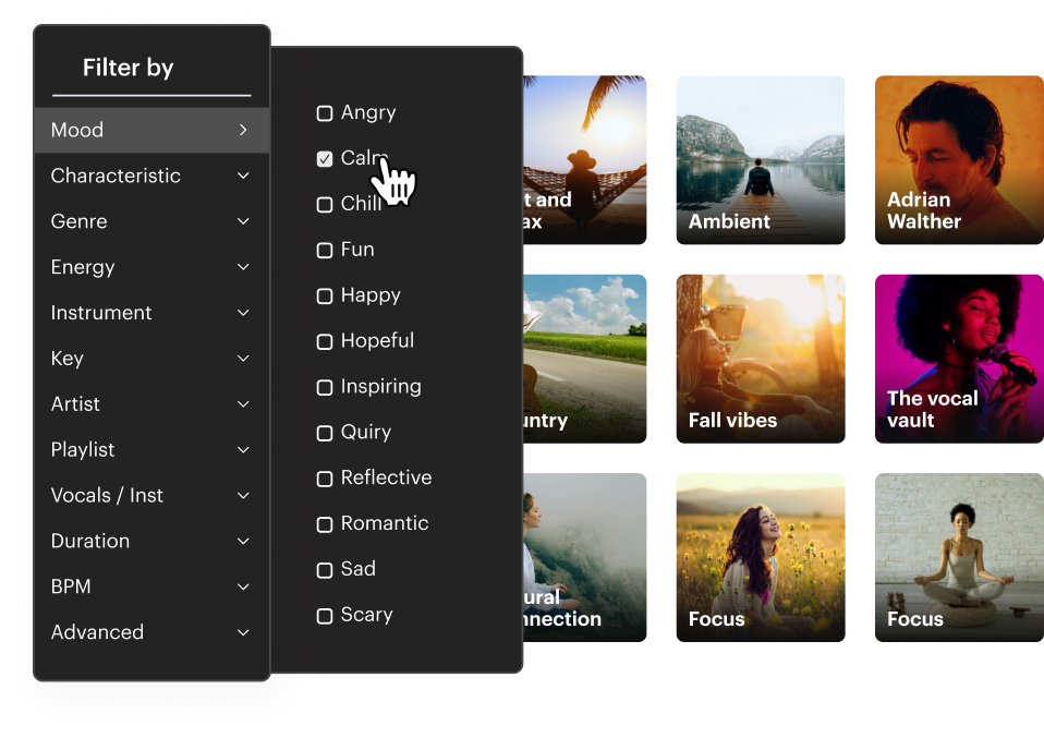 Filter songs by mood, genre, key, BPM, and more. Use AI Search to find your sound. Tell your story like you imagined.