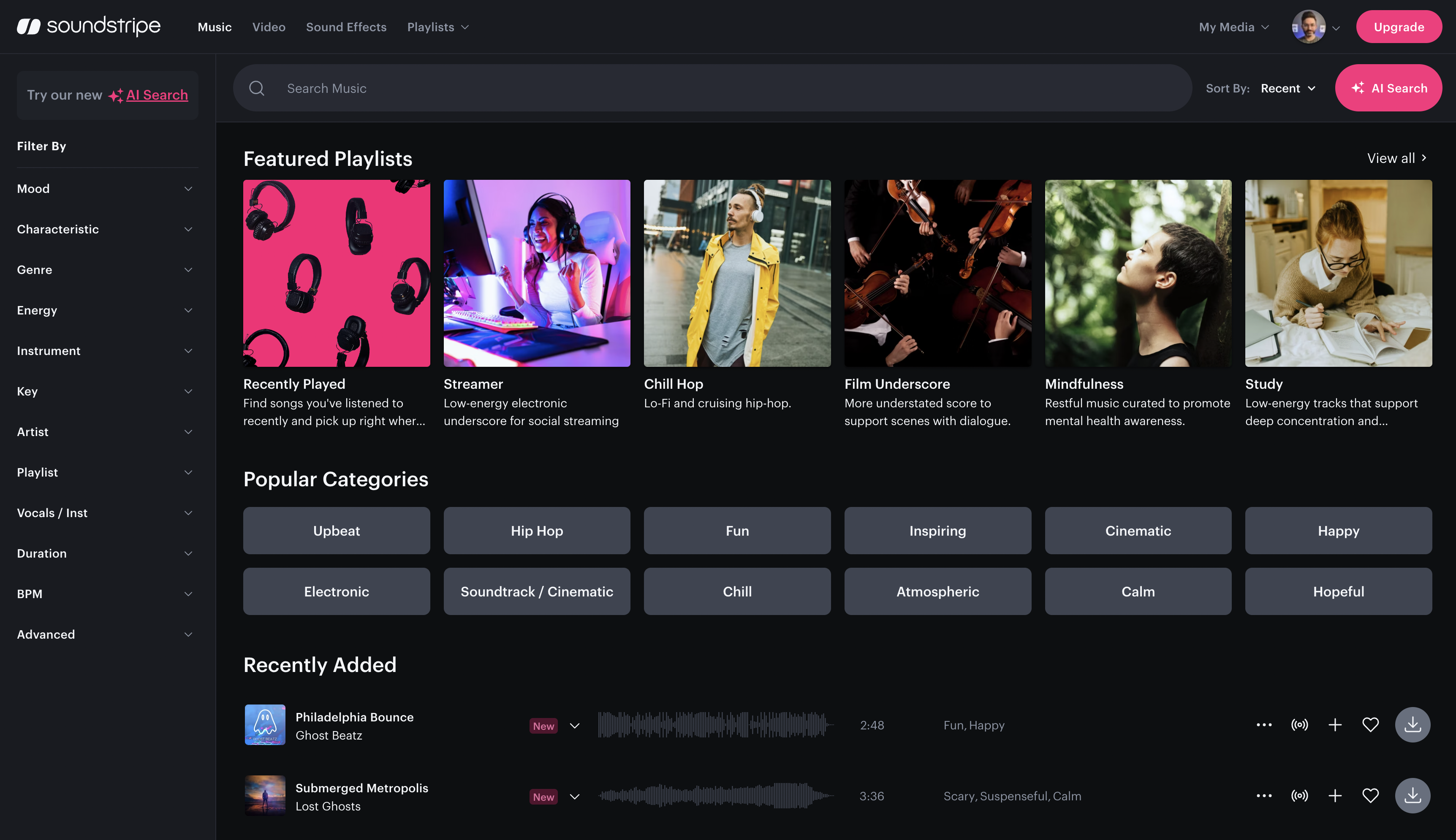 At Soundstripe, we are obsessed with delivering an exceptional user experience. Our AI-integrated music search feature takes your journey to new heights by eliminating the frustrations caused by limited search capabilities.