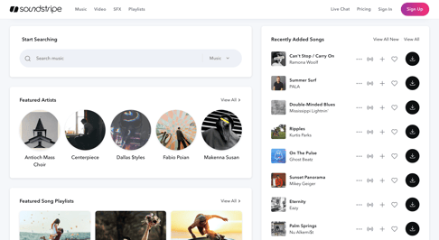 Soundstripe offers upwards of 7,000 songs, with around 200 new tracks added each month and curated by our in-house team of engineers. Other plans include access to 60,000+ sound effects and 100,000+ stock video clips.
