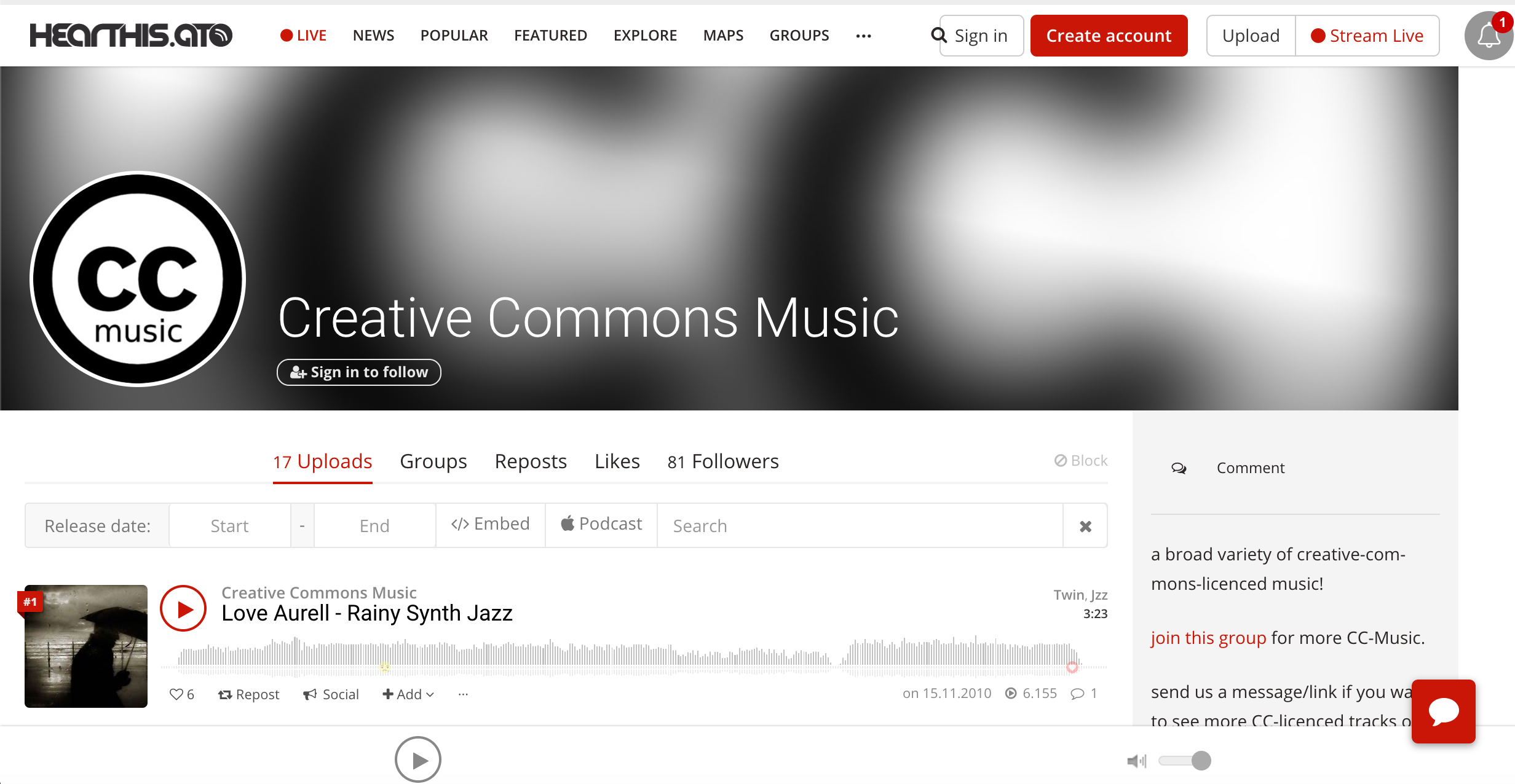This option includes more than 9,000 songs and 1,500 full albums. You don’t need an account to access content from CCTrax, but you will need to get in touch with the artist and figure out the details of a licensing agreement.