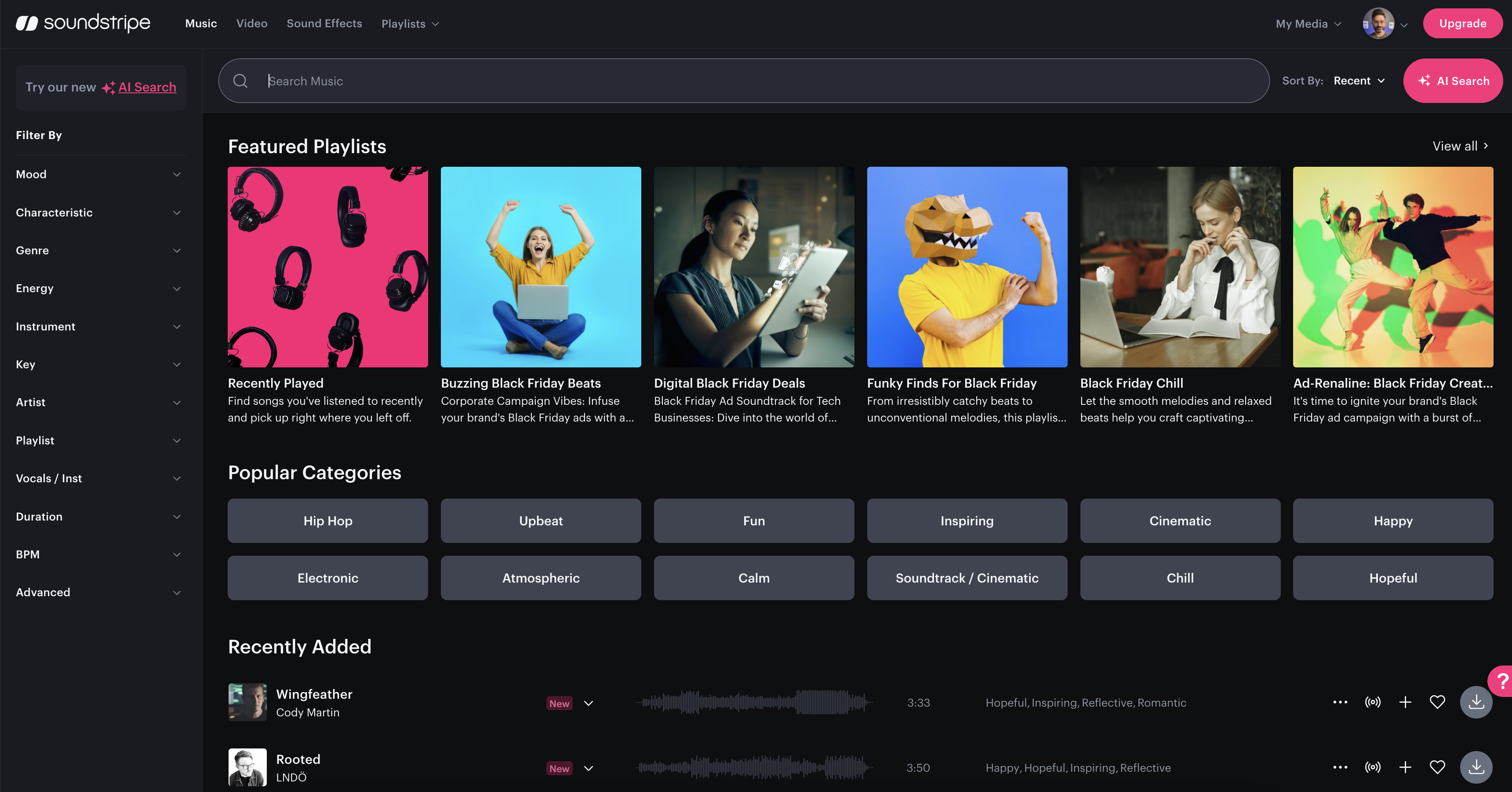 Soundstripe's AI Music Search and Core Music Search are two essential tools that can help you make the most of our vast music collection. Whether you need inspiration or have a precise musical concept in mind, we have the features to assist you efficiently.