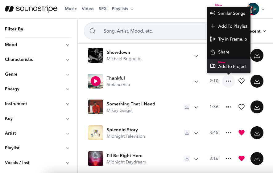 You can add an item to a project right from your search as you browse in a Music, SFX, or Video page. On any media item, click the three ellipsis icon to select the "Add To Project" option.