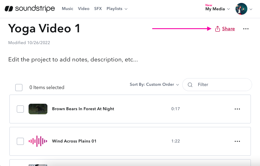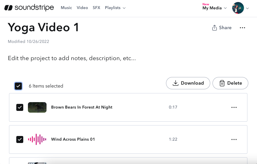 Pro, Pro Plus & Enterprise customers can download multiple assets from a project with one click. You can select which songs, SFX, and videos from your project you want to download, and then click the Download button.
