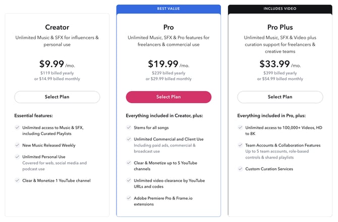 For a $9.99 monthly payment (or $119 yearly), you’ll get access to our Creator plan — that gives you unlimited access to thousands of high quality songs and SFX. And if you upgrade to the Pro plan or Pro Plus plan, you’ll unlock even more amenities.