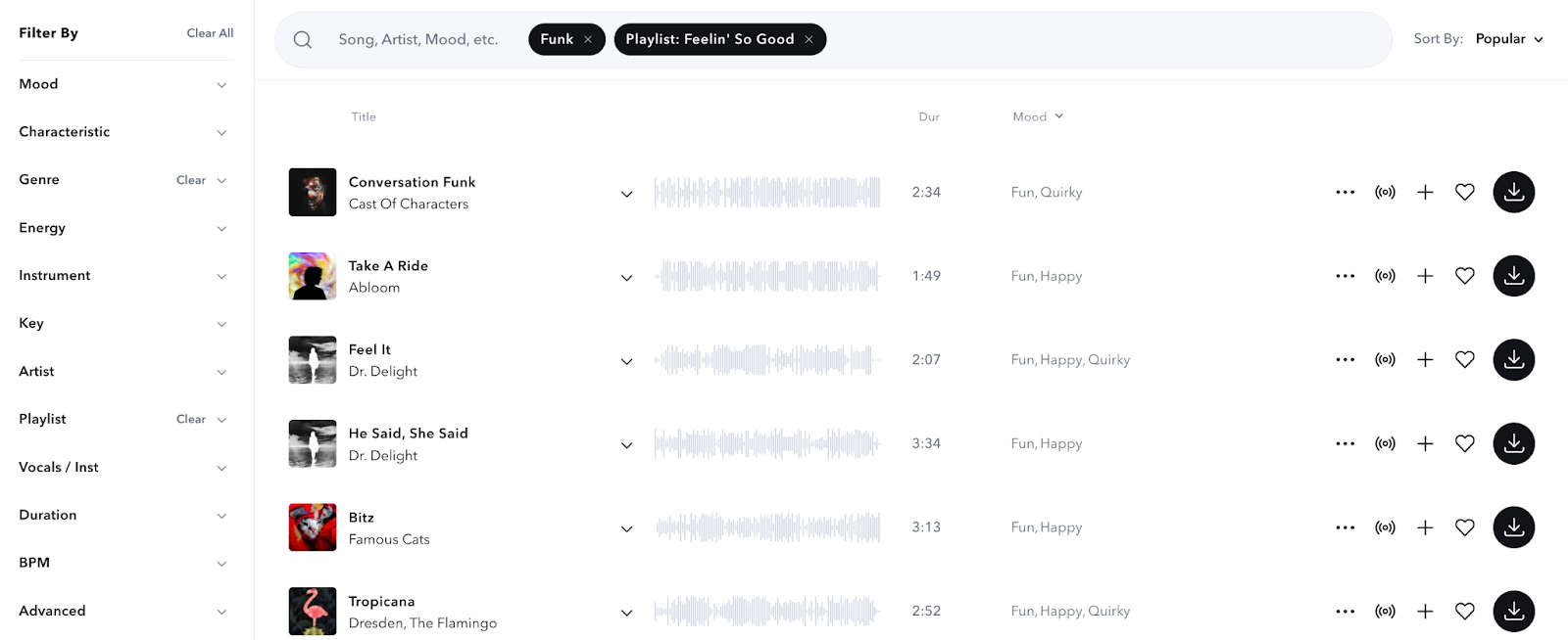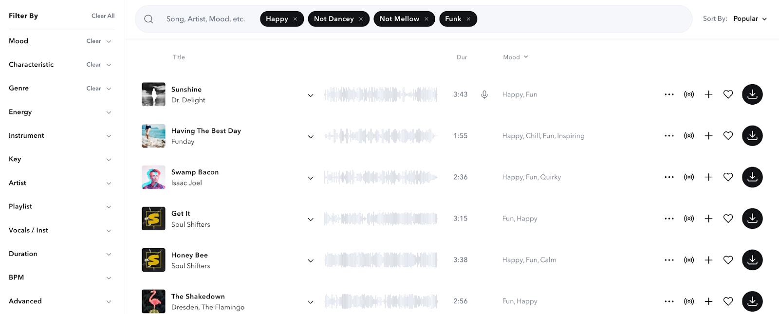 Starting your search with our funk music playlists and then using the filter functions can help you find the type of funk music you’re looking for in no time. Instead of sorting through all 7,000+ songs in our library, you get a more curated selection right off the bat.