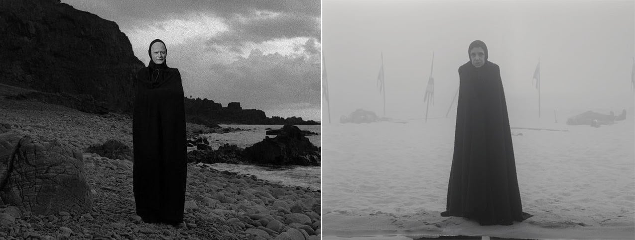Bergman’s personification of death (on the left) from The Seventh Seal might be one of the most infamous characters in his entire filmography. While that image has been both copied and parodied over the years (we’ll look at a few notable examples below), Coen’s witch character from Macbeth is a spot-on homage to Bergman’s classic character.
