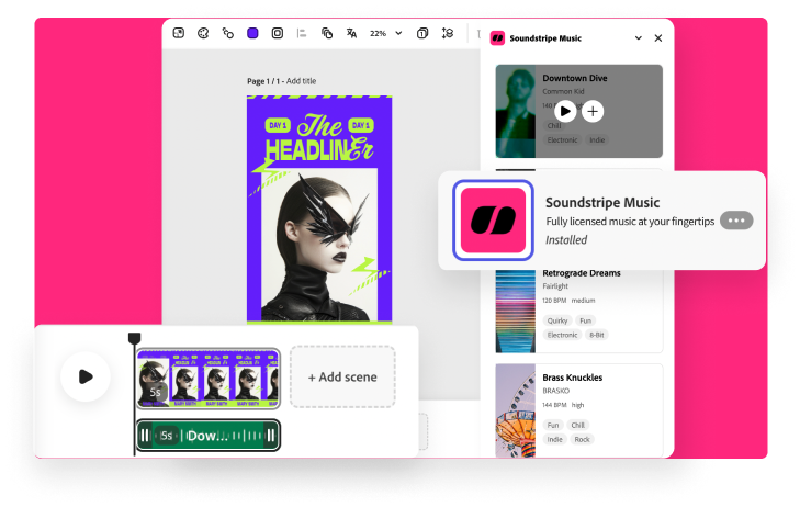 Effortlessly browse Soundstripe’s extensive library of premium music and instantly add tracks by Grammy-winning artists, right inside Adobe Express.