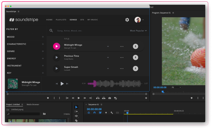 Sync Soundstripe with the tools you already know and love—Adobe Premiere, Express, Frame.io and Twitch—so your creativity never misses a beat