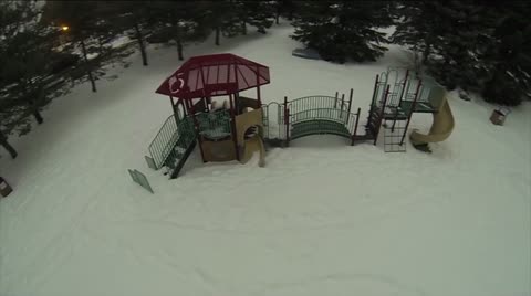 A playground for children, snow covered and empty.