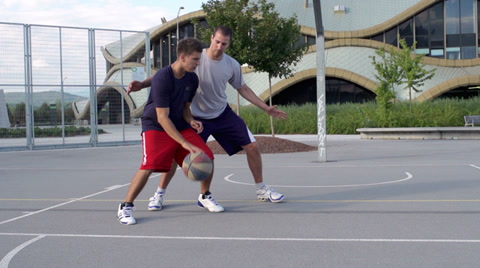 Slow motion low angle of a professional basketball player penetrating and scoring with a slam dunk while playing basketball one-on-one