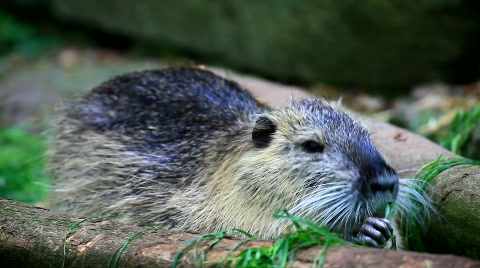 Cinematic Closeup, Cute Coypu Nutria (Myocastor Coypus) Eating In Shallow