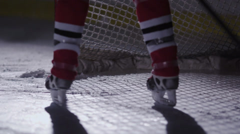 A player in hockey ties laces on skates before the game. Action. Close up of male hands prepares himself for a hockey match